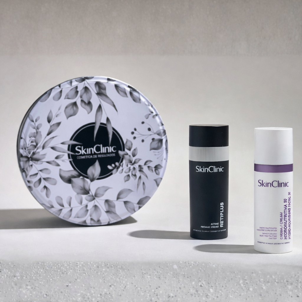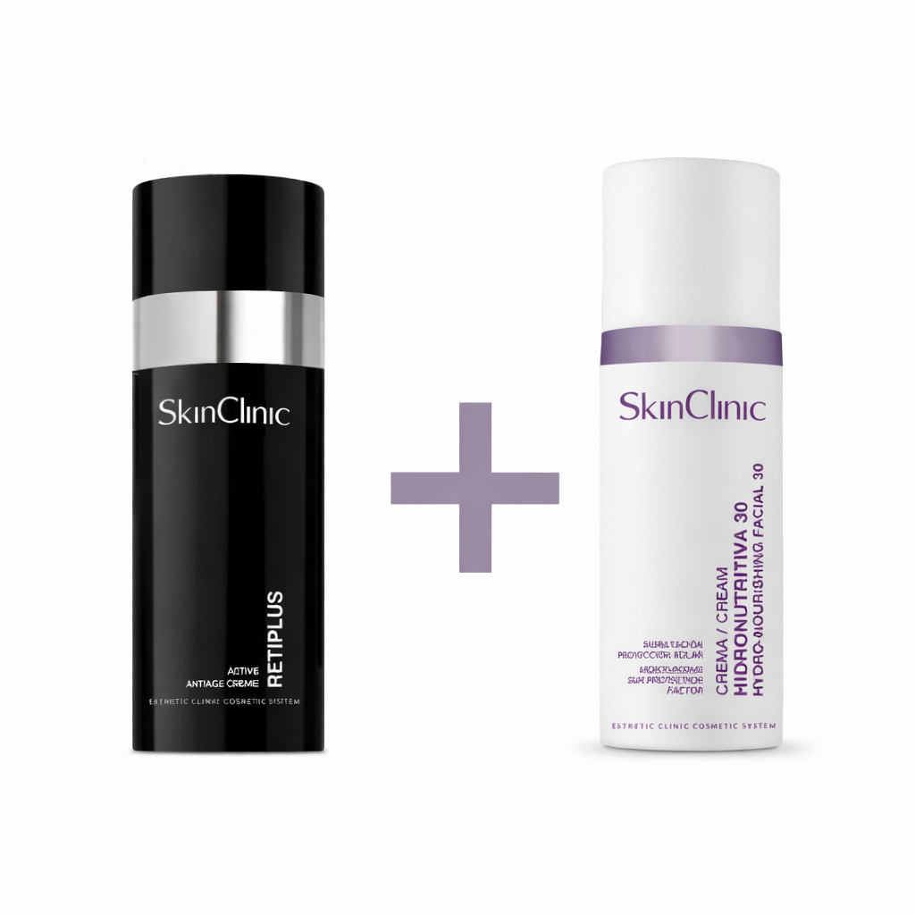 Pack antiedad SkinClinic con Retiplus (retinol) y Crema Hidronutritiva, diseƱado para reducir arrugas, mejorar la firmeza, hidratar intensamente y aportar luminosidad a la piel. Ideal para pieles maduras o con signos de envejecimiento.
